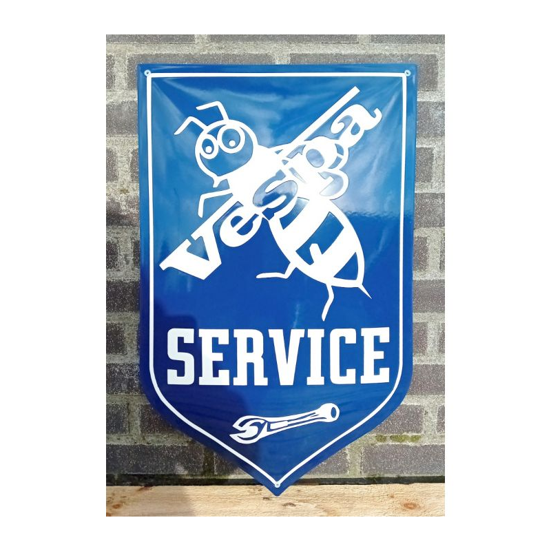 Ce modèle reprend la forme d'un écusson ou d'un bouclier de service, typique des plaques de garage d'époque. Il met en valeur le service après-vente de la marque Vespa.