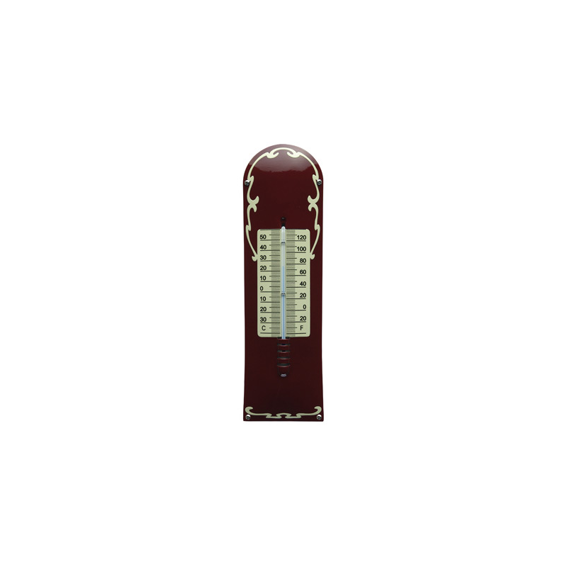 Ce thermomètre en émail bordeaux, avec décoration classique, est idéal pour l'extérieur. Taille de 12x43cm.